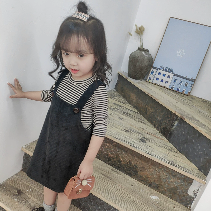 Trẻ em mặc bé gái mùa thu 2018 áo thun sọc nước ngoài + váy quây họa tiết hai dây hoang dã cho bé