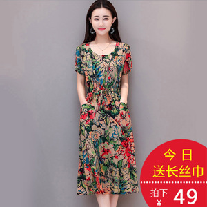 Phụ nữ trung niên bông lụa váy mùa hè ngắn tay phần dài lỏng mẹ váy kích thước lớn váy 40-50 tuổi