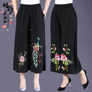 Mùa hè quốc gia phong cách của phụ nữ thêu hoa đàn hồi eo quần chân rộng trung niên mẹ nạp bông váy quần chất béo quần chân