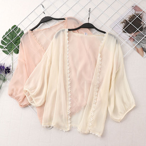 Mùa hè ngọt đèn lồng tay áo voan cardigan ren bãi biển kem chống nắng áo sơ mi nữ phần dài lỏng bên ngoài khăn choàng