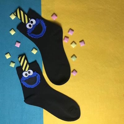 2019 Chen Xiaoshu handmade cá tính vớ mè đường phố hoạt hình dán vớ cotton đường phố vớ thể thao màu đen vớ nữ - Vớ bông