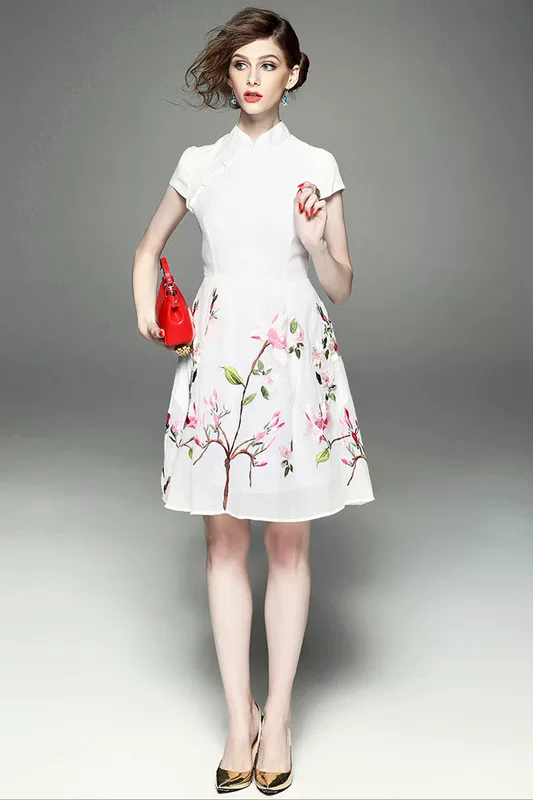 Trung quốc phong cách cổ áo cổ áo khóa khóa cải tiến hàng ngày thêu sườn xám gió quốc gia eo một từ thêu váy mùa hè