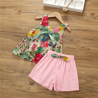 Cô gái mới thiết lập thời trang mùa hè Hoa bé Áo phông hai mảnh + Quần bé gái Quần áo trẻ em mặc