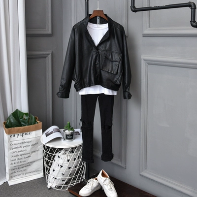 Áo khoác da nữ màu đen ngắn phiên bản Hàn Quốc 2018 lỏng lẻo nữ mới thủy triều bf gió pu da áo khoác oversize