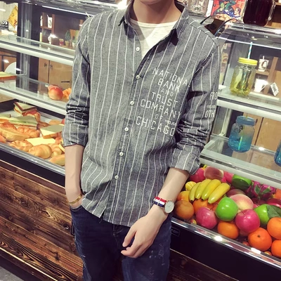 [Full 59] Mùa thu mới 2018 sọc in ve áo dài tay áo sơ mi nam bình thường