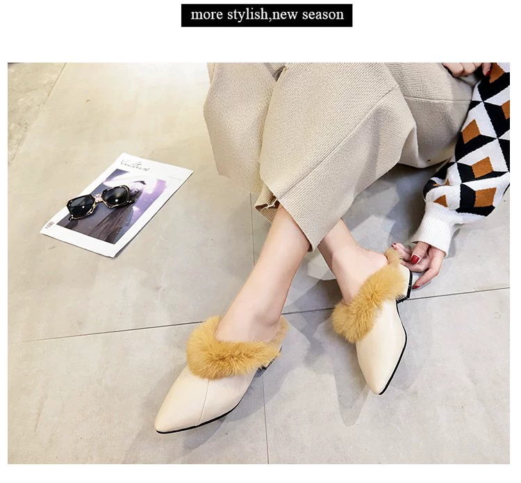Dép lông cừu nữ 2018 thu đông mới màu đỏ ròng với cùng một chiếc giày cao gót mũi nhọn nửa dép dày với thời trang giày Lok Fu thủy triều