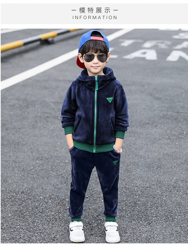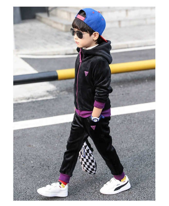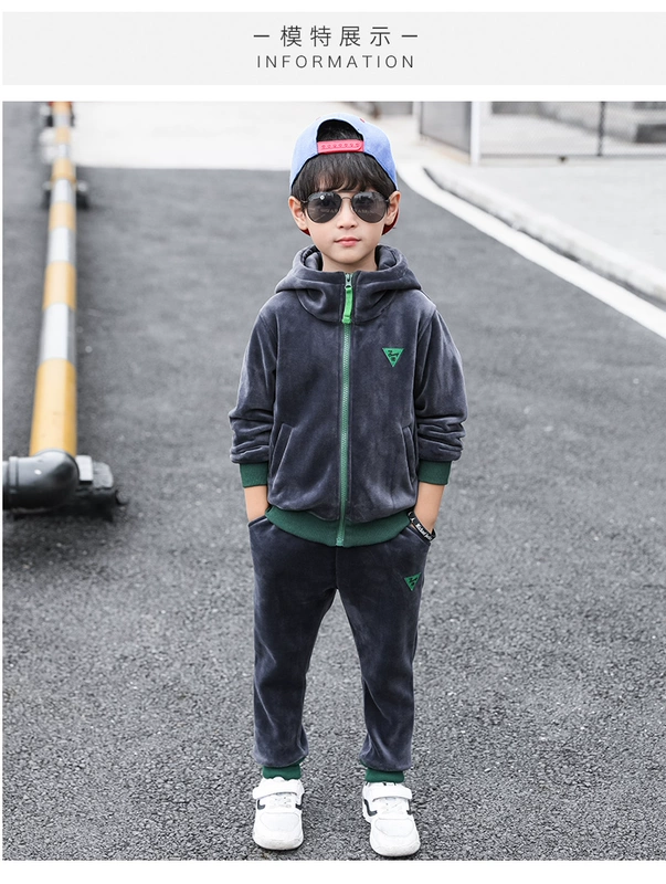 Bộ đồ nhung vàng cho bé trai mùa thu đông 2018 trẻ em lớn mới cộng với bộ nhung hai mảnh dày của phiên bản nước ngoài Hàn Quốc
