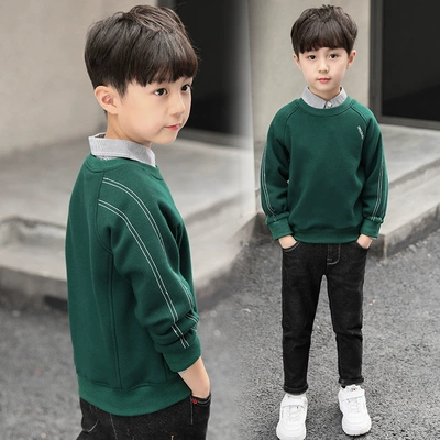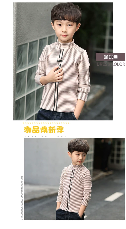 Áo thun bé trai nhung dài tay kẻ sọc cao cổ 2018 mới to boy mùa thu và mùa đông dày áo sơ mi ấm áp