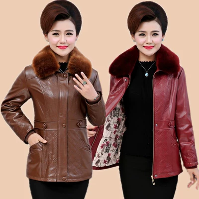 Áo khoác da nữ mùa thu và trung niên và tuổi già Mẹ tải kích thước lớn cộng với áo khoác da PU dày bằng nhung