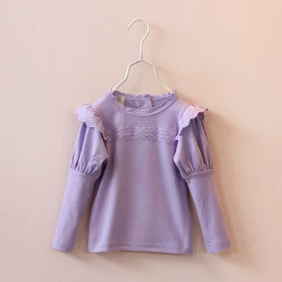 Áo thun bé gái dài tay Hàn Quốc quần áo trẻ em mùa xuân và mùa thu mỏng cổ tròn công chúa cotton áo sơ mi ren tay áo bay - Áo thun
