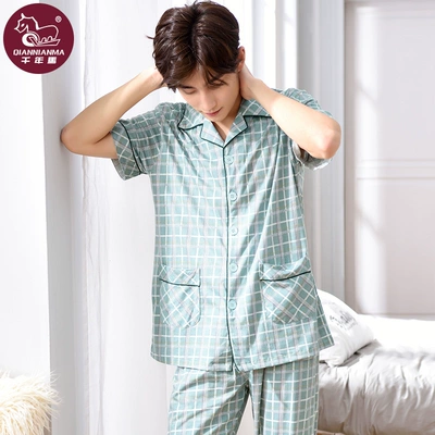 Bộ đồ ngủ nam Cotton mùa hè ngắn tay Quần nhà Dịch vụ nam Cotton mùa hè Áo len Nhật Bản XL Set - Cha mẹ và con