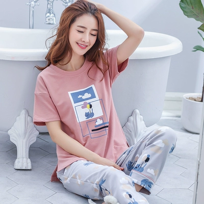 Bộ đồ ngủ nữ mùa hè Cotton tay ngắn Quần hai mảnh Set Sweet Cute Little Lady Pyjama Summer Loose Home Service
