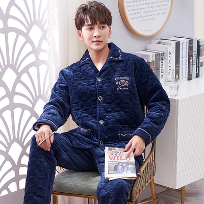 Đồ ngủ nam mùa đông dày ba lớp cộng với nhung nhung san hô nhung phù hợp với flannel dịch vụ nhà cha mô hình mùa thu và mùa đông - Cha mẹ và con