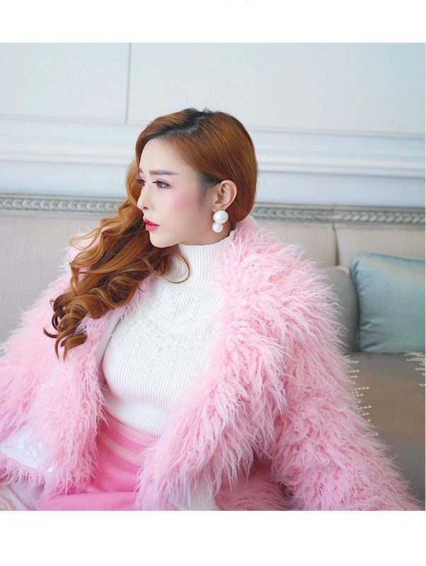 Màu hồng ngọt ngào giả bãi biển len lông thú lông lông dày nữ ấm ấm sang trọng áo thủy triều