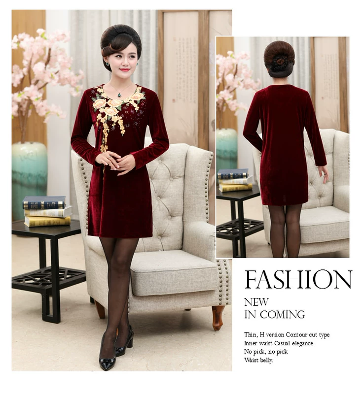 Mùa thu 2018 mới của phụ nữ trung niên váy nhung vàng Trung niên mẹ với tay áo dài 40-50 tuổi