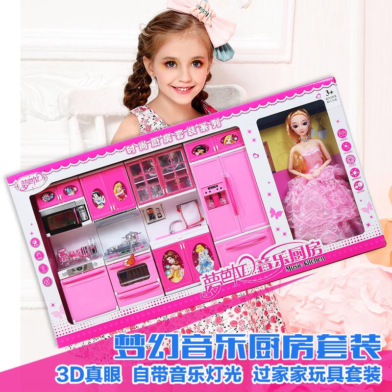 Nhạc nhẹ trẻ em chơi nhà đồ chơi mô phỏng cô gái nấu ăn bộ đồ ăn nhà bếp búp bê Barbie đặt hộp quà tặng - Búp bê / Phụ kiện
