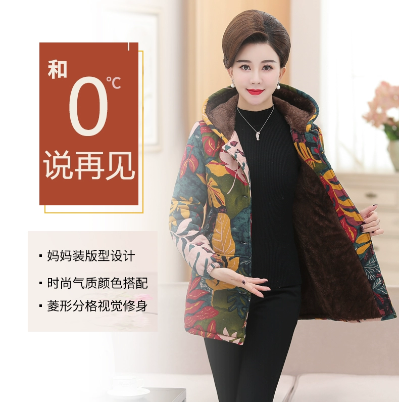 Quần áo phụ nữ trung niên mùa đông áo khoác cotton ngắn trùm đầu ấm áp cộng với áo khoác nhung cotton dày kích thước lớn quần áo cotton mẹ