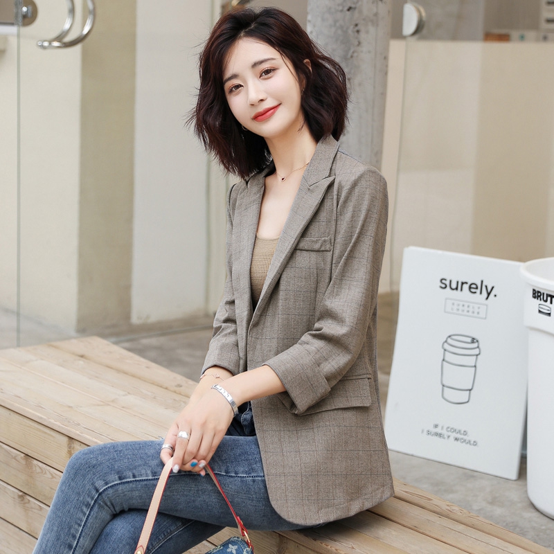 Thời trang Yangqi 2019 mùa thu mới của phụ nữ phù hợp với thời trang retro phiên bản Hàn Quốc hoang dã của áo khoác kẻ sọc giản dị lỏng lẻo - Business Suit