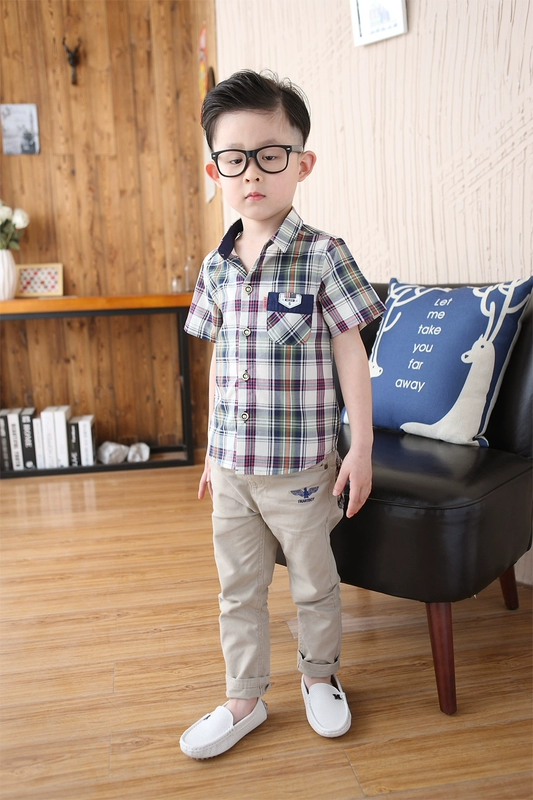 Quần áo trẻ em mùa hè cậu bé ngắn tay áo sơ mi 2017 cotton trẻ em kẻ sọc cotton áo sơ mi phần mỏng thoáng khí