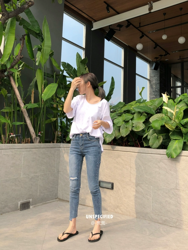 Hoang dã, rách đơn giản, viền không đều, chân nhỏ, 9 điểm, lỗ thon, quần jean co giãn