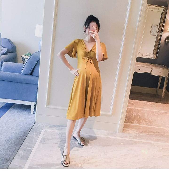 Thai sản mặc 2018 mùa hè phong cách mới neckline V-Cổ eo đàn hồi phụ nữ mỏng mang thai dài ăn mặc triều