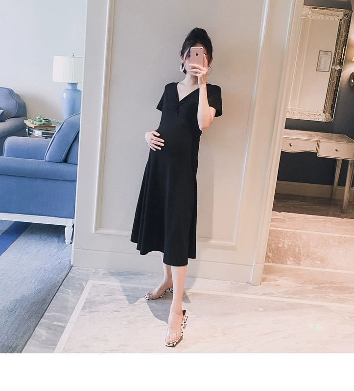 Thai sản mặc 2018 mùa hè mới v- cổ căng mỏng mỏng thời trang phụ nữ mang thai nóng mẹ áo dài Hàn Quốc