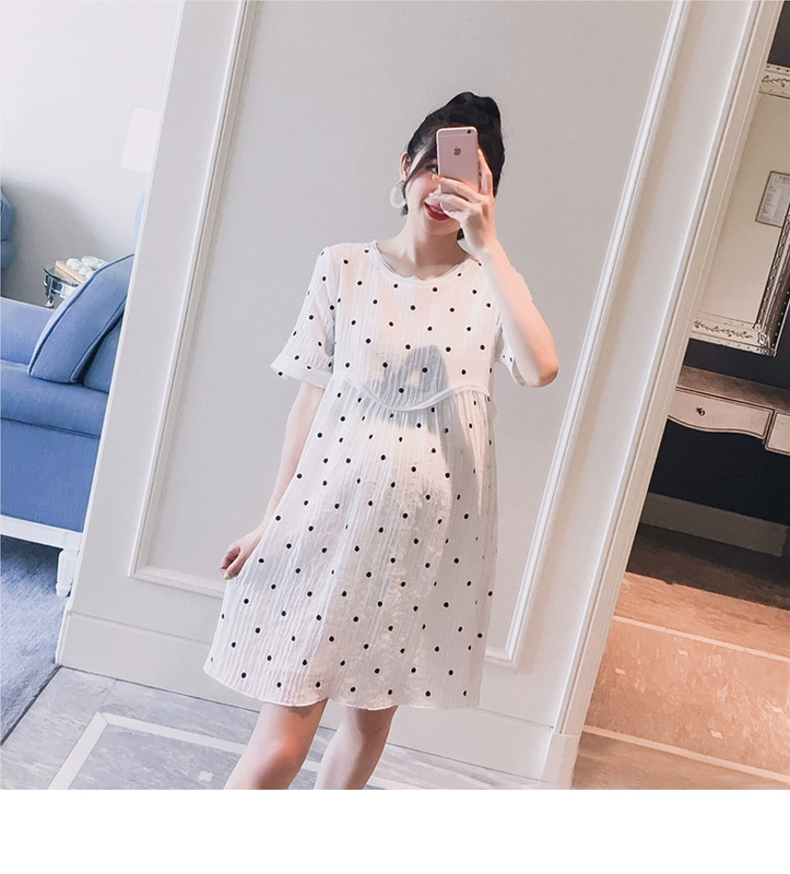 Thai sản mặc 2018 mùa hè mới Hàn Quốc phiên bản của vòng cổ điểm sóng ngắn tay lỏng thời trang phần dài phụ nữ mang thai ăn mặc triều
