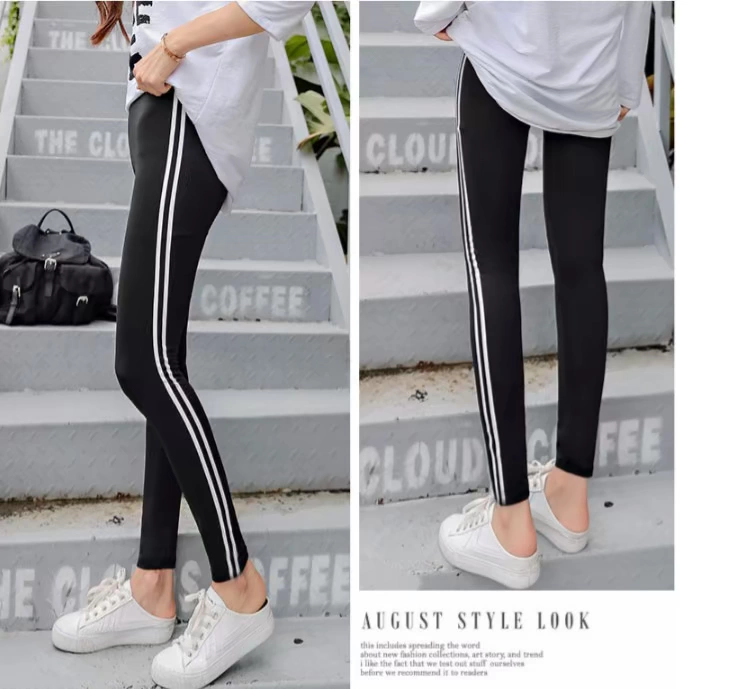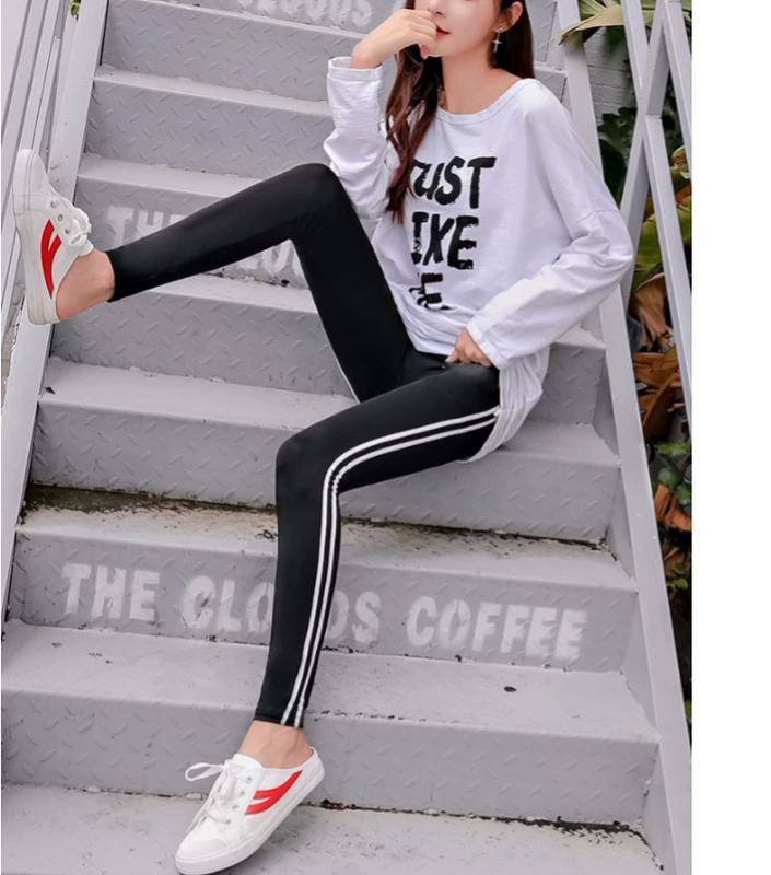 Quần legging nữ mặc sọc dọc mùa thu eo thon eo cao bên hông dải trắng co giãn kích thước lớn song song thanh phương thức chân quần