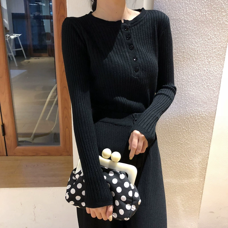 Khuyến khích mùa thu và mùa đông F và Z! Phiên bản nút đơn giản sọc dọc kết cấu áo len mỏng cổ tròn