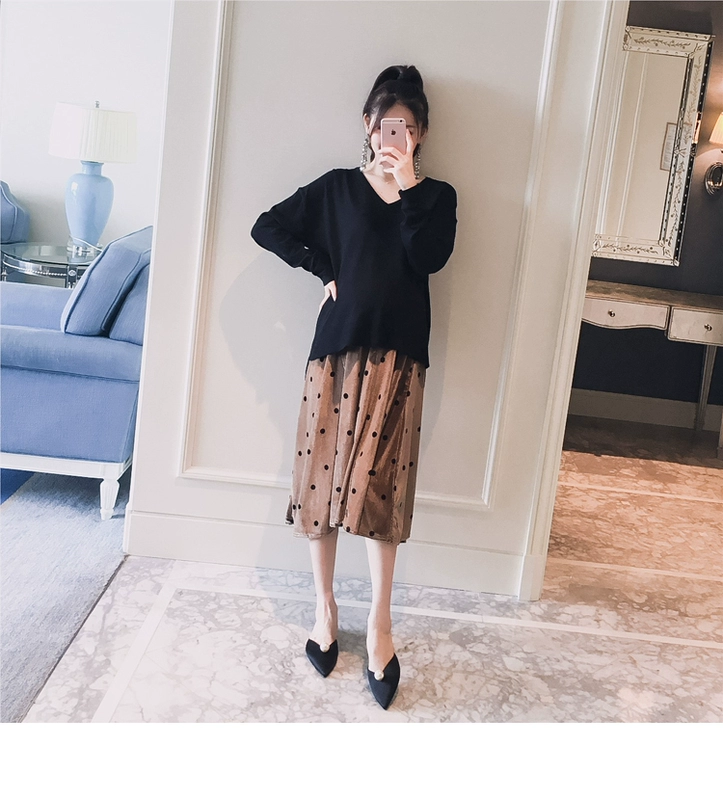 Trang phục bà bầu 2018 mùa thu mới Hàn Quốc chấm bi nhung vàng điều chỉnh Một phiên bản thời trang mẹ bầu hot mẹ hot