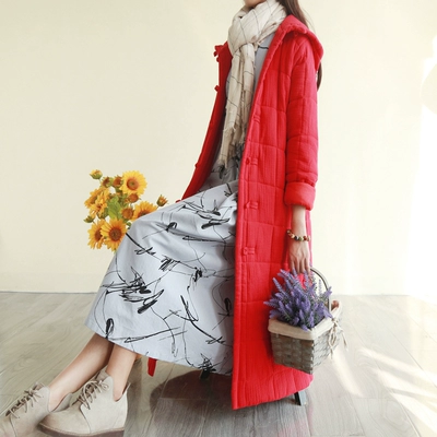 Áo gió quốc gia retro khóa áo cotton trùm đầu mùa thu và mùa đông cotton và áo khoác lanh nữ ấm áp áo choàng cotton dài