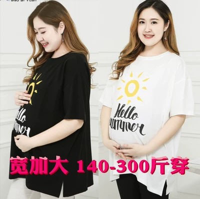 Bà bầu có kích thước lớn Váy ngắn tay 200 kg mùa hè cộng với phân bón XL Phụ nữ mang thai áo thun cotton mùa hè rộng 300 kg - Áo thai sản