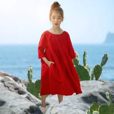 Cô gái phong cách nước ngoài mùa xuân và mùa hè Váy phiên bản Hàn Quốc của trẻ em lớn cotton và vải lanh trẻ em dài tay Mori cô gái trên đầu gối váy dài cô gái váy
