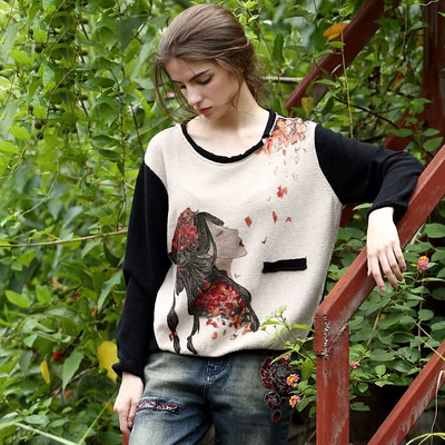 Jie Ran áo len khác nhau của phụ nữ đầu rộng kích thước lớn của phụ nữ mùa thu và mùa đông hoang dã in áo sơ mi nữ 3098 - Vòng cổ áo len