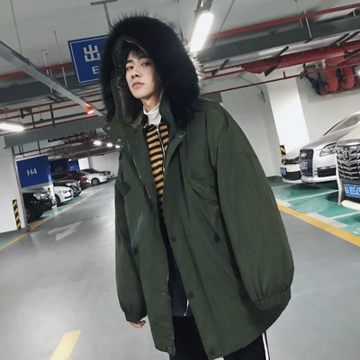 Mùa đông Hàn Quốc bat tay áo bông lỏng bf gió lớn lông cổ áo trùm đầu dày bánh mì áo khoác nam