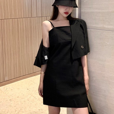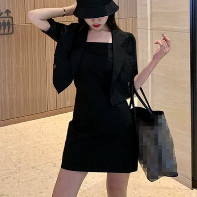 Mùa hè 2019 mới tay ngắn phù hợp với áo khoác nhỏ + Đầm công sở thời trang phù hợp với quần áo hai dây màu đen - Bộ đồ