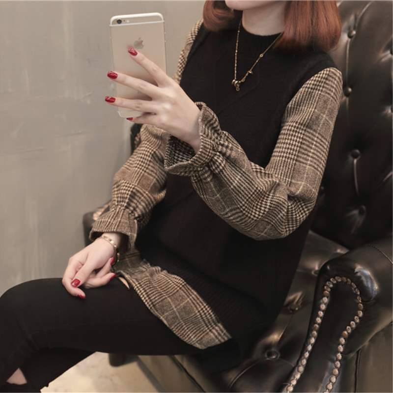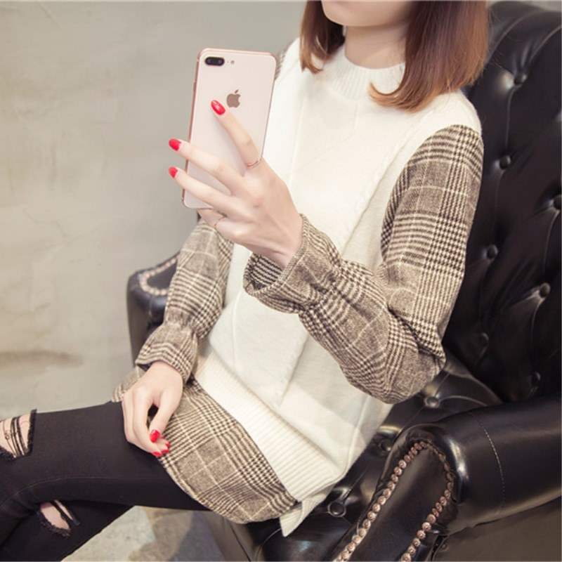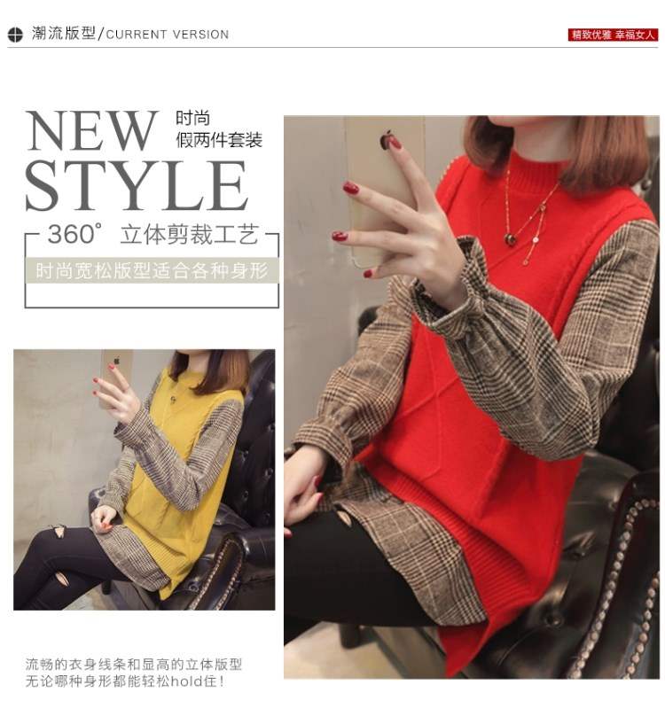 Mùa phù hợp với phụ nữ áo len nữ vest giả hai mảnh phù hợp với áo sơ mi cổ tròn thời trang áo len ngắn - Vòng cổ áo len