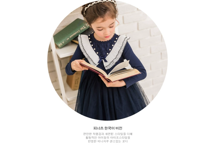 Thuyền cô gái mùa thu 2018 Mới màu xanh cổ áo ren Váy váy trẻ em Váy bé