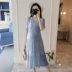 Váy bà bầu hè 2019 thời trang mới mẹ bầu cổ chữ V cho bà bầu mặc váy dài đến đầu gối mùa hè cho con bú - Áo thai sản