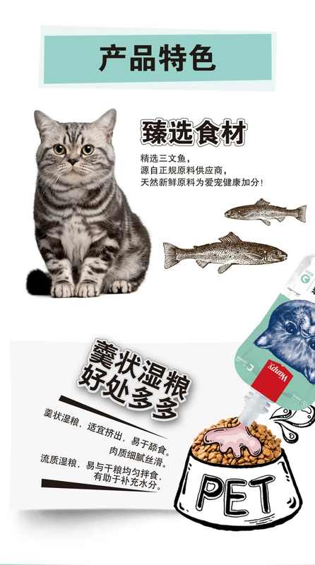 Wanpy nghịch ngợm mèo mới đồ ăn nhẹ chủ yếu thực phẩm thịt tươi nước sốt thịt mèo nước sốt 90g đóng hộp gói tươi 4 túi - Đồ ăn nhẹ cho mèo