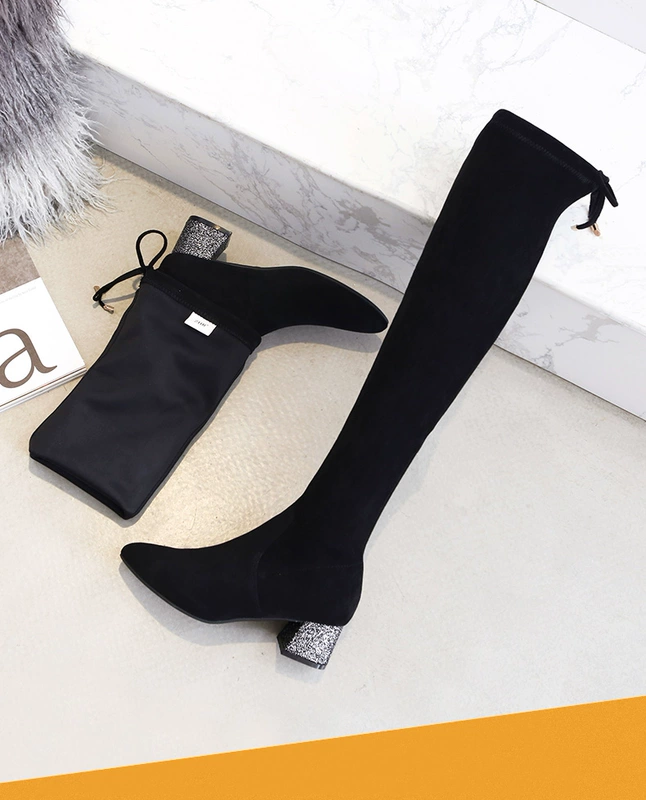 ZHR2018 thu đông mới dày với giày cao đến đầu gối, giày cao gót co giãn cao đế mỏng ống cao